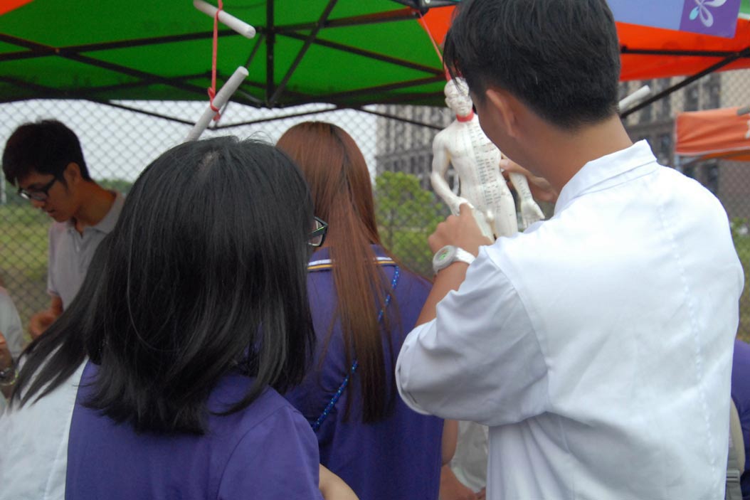 中药协会把艾灸、针灸带上了展位,药味十足,吸引了不少喜欢中药、注重健康的同学。来自理工学院的陈超淇说道:“平时比较少接触到中医,但其实广东人很喜欢中医药这方面,曾经在香港的电视剧里面看到过类似的场景。刚才我体验了一下师兄的按摩,感觉特别厉害!”