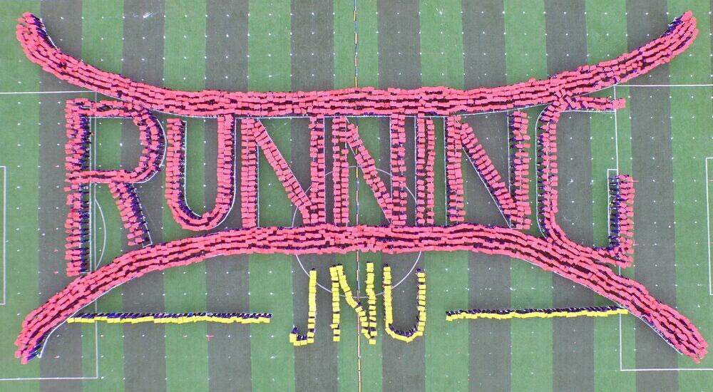 9月20日,新生训练营的后一天,他们早早起床,精神抖擞地出现在运动场,为着武术汇演,为着集体荣誉准备着。表演现场,本部新生摆出了“JNU109”的创意造型,南校区新生摆出了“RUNNING JNU”的 创意造型,表达了新暨南人们对暨南园的热爱与祝福。?